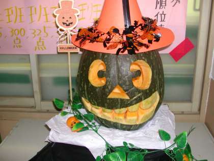 今日は,読み聞かせボランティアの方のご好意で素敵なかわいい「お化けかぼちゃ」が職員室前に登場しました。たちまち「お化けかぼちゃ」は,人気者になり,子どもたちは,立ち止まって見入っていたり,話しかけたりしていました。
