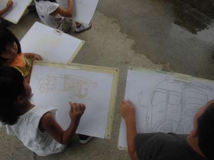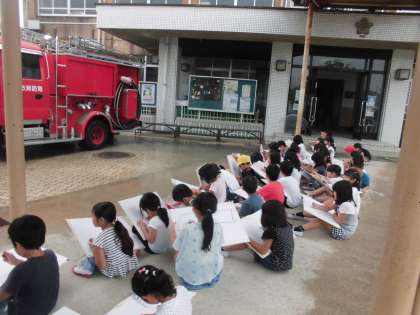 避難訓練の後,消防車の絵を描かせてもらいました。短い時間でしたが,とても集中して写生をしていた1年生の子どもたちでした!