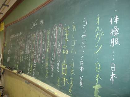 社会では、「工業製品と貿易」という学習に入りました。教室にある物のふるさと調べをしました。「MADE IN ○○」と書いてあるものを探していくと、日本製のものがとっても少ないことに気づいていました。