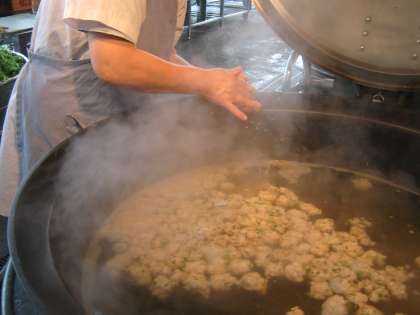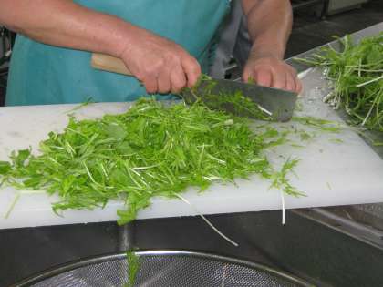 京都市の給食では,地産地消にも取り組んでいます。京野菜もいろいろ給食に登場しています。今日は,「水菜」を使ったはりはり鍋です。地元京都でとれた水菜です。 シャキシャキとした歯ごたえのある野菜です。給食室できれいに洗って,食べやすい大きさに切ります。つみれは,ツナ(まぐろ)缶と鶏ひき肉,細ねぎ,しょうがを混ぜ合わせて1つ1つつみれを作っていきます。体の温まるおかずです。今日の給食は「胚芽米ごはん・牛乳・水菜とつみれのはりはり鍋・ひじきの煮つけ・柿」でした。