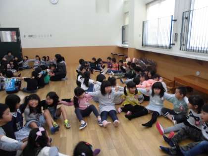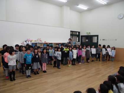 つぼみ保育園の年長組さんと,交流会をしました。はじめに,年長組さんの歌や合奏を聴かせてもらいました。その後,じゃんけんゲームやふれあいあそびで一緒に遊びました。最後に,美豆小学校の1年生から,「あきのおみせ」に招待するために,言葉やポスターで発表をしました。今度は,つぼみ保育園の年長組さんが,美豆小学校に来てくれます。これから,「あきのおみせ」に向けて,みんなで準備を頑張ります!
