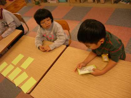 道徳の時間には、できるかなゲームをしました。「トイレのスリッパをそろえる」「靴箱の靴を整頓する」「机の中を整頓する」などなど、指令の書かれたカードをめくって、書かれていることを読み、「できる人〜?」「は〜い!」と大きな返事をして任務を遂行します!