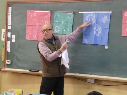 2月7日(水)京の匠ふれあい事業(京の匠先生派遣事業)を受けて3年生が京鹿の子絞体験学習をしました。真っ白の布にビーだまや割りばしを輪ゴムでくっつけたり,洗濯バサミではさんだりして模様を作る準備をしました。10名もの先生方にお世話になり,一つひとつ丁寧に教えていただきましたおかげで素晴らしい作品を作ることができ,どの子も大変満足していました。お世話になりました,京鹿の子絞り振興協同組合の皆様本当にありがとうございました。