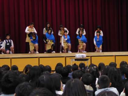 日頃の練習の成果を発揮し,大きな声で号令をかけて頑張って発表しました。今年度の発表は最後です。終了後感想を交流しました。見ていた児童からは,「災害に備えた知識を吸収できてよかった。」発表した児童からは「学んだ知識を活かしていきたい。」等の声があがりました。発表する姿を称えるだけでなく,災害時の行動の有り様について,意識を高める事ができました。