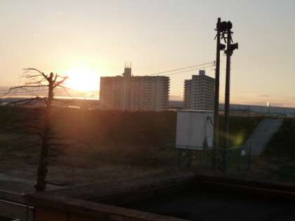 おはようございます。朝やけが美しく,寝ぼけ眼に刺激がありました。気温4度。宇治川にも靄がたち込めています。
