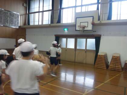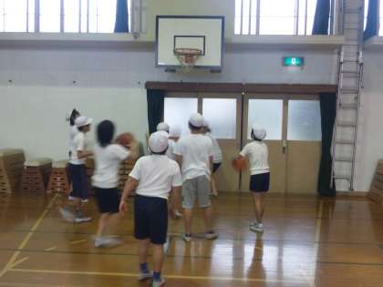 バスケットボール開始1時間目の6の1。怪我の防止についての指導を受けたあとチーム練習・個人練習をしました。「シュートは山なりのボールを意識して」練習しました。