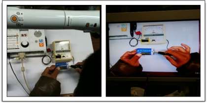 手元の操作を実物投影機を使い,大型ディスプレイに映し出し,操作方法をしっかり確認した後,個人,そして,グループ実験をしました。★ミ!