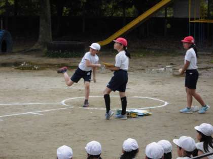 まず最初に高学年から体力測定を行います。続いて,美豆小学校恒例の高学年によるサポート体制のもと,中学年の体力測定を行いました。