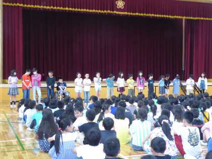 全学年が体育館に集まって,運営委員会の6年生の司会で集会が行われました。