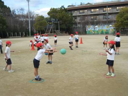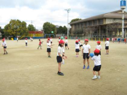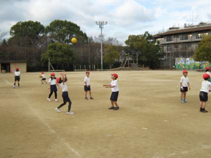 班で30回を目標にパスを回したり,パスをしながら移動する練習にも挑戦しました。ドッジボールとちがって,相手の受けやすいところにボールを投げるという難しさもあるけれど,これからどんどんうまくなって試合ができるようになってほしいと思いました☆