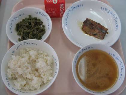 献立は「さんまのかわり煮・三度豆のごま煮・豚汁」です。『さんまのかわり煮』は赤みそやトウバンジャンや米酢も入り,さっぱりした味付けになっています。骨までやわらかく煮付けてもらっているので,多くの児童が骨ごと食べていました。