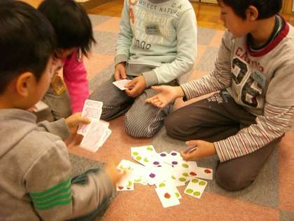 手元の札と同じ絵が出てきたら、「チーン!」と一押し☆4人で仲良く遊んでいます♪