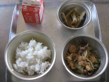 今日の給食は「ごはん・牛乳・すき焼き風煮・たたきごぼう」でした。