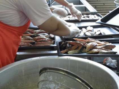 “さけの塩こうじ焼き”は,初めての焼き魚でした。てらし切りという切り方のさけを,発酵調味料の塩こうじにつけ込み,スチームコンベクションオーブンで焼きました。塩こうじにつけ込むことで,魚のたんぱく質が分解され,うま味やあま味を引き出しおいしく仕上がりました。