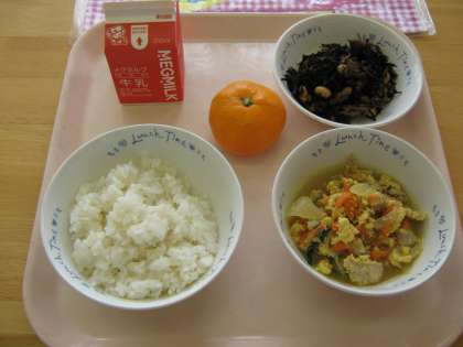今日の献立は「胚芽米ごはん・牛乳・親子煮・ひじき豆・みかん」でした。親子煮には三つ葉が入り,きれいな彩りでした。 ランチルームでの給食も,もちろん全部残さず食べられました。