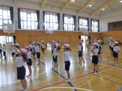 2年生は,運動会の団体演技「みんないっしょに ドラえもん」の練習を頑張っています。少しずつ動きを覚え,楽しんで踊っています。