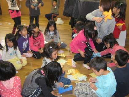 この日のために準備してきた遊びを持って,つぼみ保育園へ向かいました。はじめにお互いに挨拶をして,一緒に歌をうたいました。そのあと全体で少しゲームをしてから,いよいよ遊びのお店屋さんの開店です!おもちゃを一緒に作ったり,遊びを教えてあげたり,一緒に遊んだりしました。年下の子にやさしく接してあげている子もいたりして,少しお兄さんお姉さんになった気分を味わっていました☆