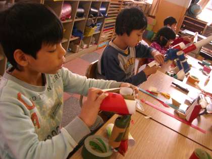 何本かの芯を組み合わせて,「これは足やねん!」「マイクにするわ!」と,イメージを膨らませていました。