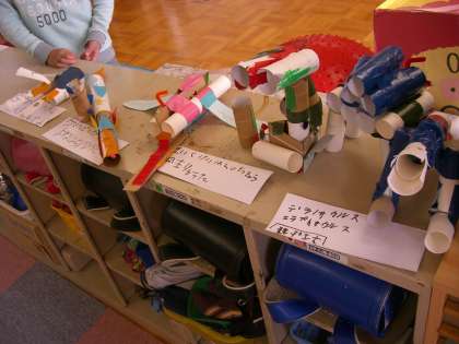 冬休みがあけてから,ずーっとお家でためていたトイレットペーパーの芯を使って工作をしました!