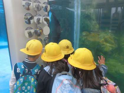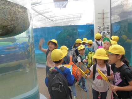 1年生と一緒に,バスに乗って「京都水族館」に社会見学に行ってきました。水族館内は,1年生・2年生の混合グループで行動しました。1年生と一緒に過ごしながら,いつもよりお兄さん・お姉さんらしい姿がたくさん見られ,その成長を感じました。