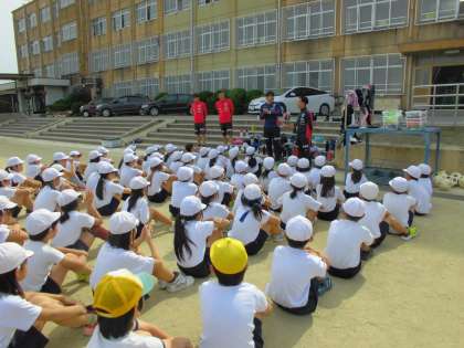 「ボール一つあれば,一人でも二人でもたくさんいても,色々な運動をすることができ,楽しむことができたり,友だちが増えたりする」ということを,コーチや選手から学んだ子どもたち。