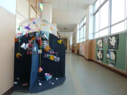 おはようございます。どんより曇り空から雨が落ちてきています。今日は一日雨模様です。その分,気温は高く,寒さを感じません。校内では,作品展が始まっています。さまざまな工夫を凝らした力作が,ろうかや教室などに展示してあります。明日は授業参観日です。作品もぜひご覧ください。