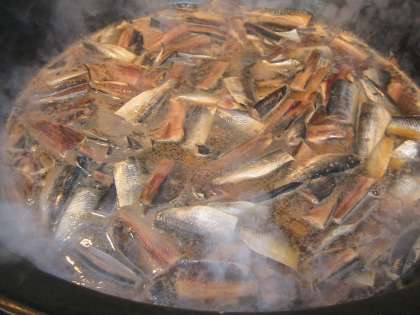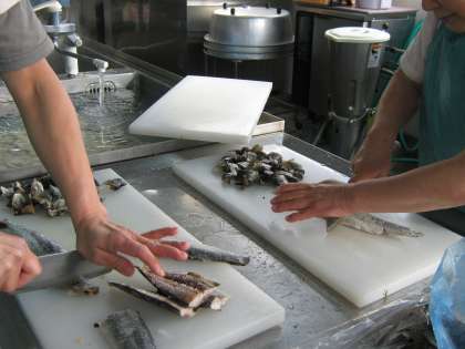 にしんは冷凍で納品されます。解凍して頭を落としてから半分に切ります。1人1/2枚です。(写真左) 大きな鉄釜で甘辛くコトコトと煮つけていきます。(写真中央) 副菜は,京のおばんざいの1つの「おから」です。油揚げ・ひじき・にんじん・青ねぎが入っています。おからは食物繊維がたっぷりです。 春を告げる野菜「花菜」のすまし汁との組合せでした。(写真右)