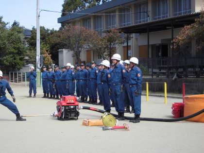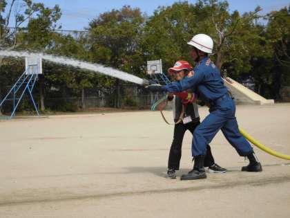 伏見消防分団の訓練の様子も披露されました。消防分団には美豆小学校の卒業生が放水訓練に参加して活躍していました。卒業生が,地域の安全を守り支えてくださってくださっていることが何より頼もしくありがたいことです。