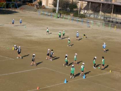 もう自分たちだけでコートを作ったり,自分たちで試合を進めていくこともできるようになりました。チームで作戦会議をしたり,声をかけ合ったりと,協力する姿も見られます。