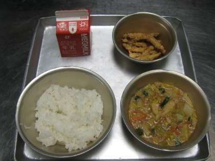今日の献立は「ごはん・牛乳・わかさぎのこはくあげ・マーボはくさい」でした。
