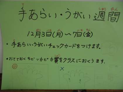 明日から12月。これからかぜやインフルエンザがはやってくる時期です。手洗いうがいでしっかり予防しましょうね。
