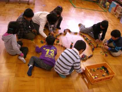 協力してドミノを作って…「あ!」と倒れて…。そんな調子で,仲良く遊んでいました♪