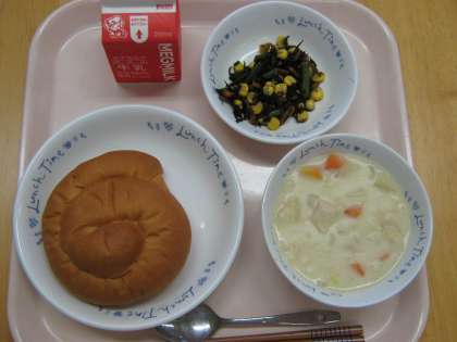 今日の献立は『バターうずまきパン・牛乳・手亡豆のクリームシチュー・ひじきのソティ』でした。