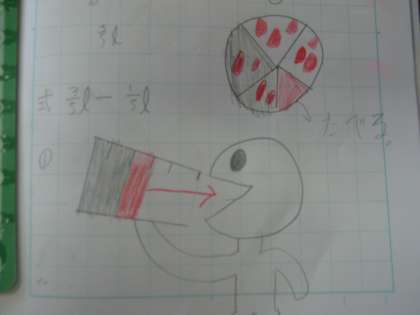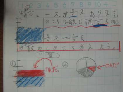 分数の足し算・引き算の計算の仕方を一人ひとりがノートに考えを一生懸命考えて書いています。ノートの書き方も工夫して色をつけたり,絵や丸図や線分図などの近くに言葉で説明を加えて表しています。