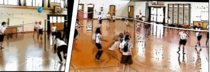 今日から体育・ソフトバレーボールの学習がはじまりました。体育館に3つのコートを設置しゲームをします。ビーチバレーボールのようなやわらかいボールを使ってのバレーボールです。