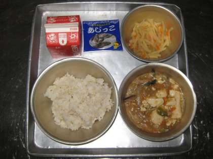 今日の給食は「麦ごはん・牛乳・五目どうふ・じゃがいものピリカラいため・じゃこ」でした。