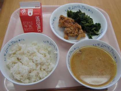 副菜は『ほうれん草のおかか煮』と『豚汁』です。ほうれん草のおかか煮は出し昆布で,豚汁は削り節でだしをとっています。今日の給食は「玄米ごはん・牛乳・さわらのたつたあげ・ほうれん草のおかか煮・豚汁」でした。