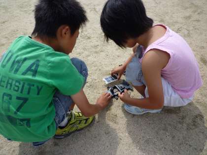 光電池のはたらきを調べました。光電池で豆電球に明かりがついたり,モーターでプロペラが回ったりしました。光電池を使う場所や向きで電流の大きさが変わることを学習しました。