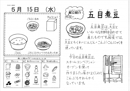 5月15日の献立は,「ごはん・牛乳・豚肉とキャベツのみそいため・五目煮豆」でした。