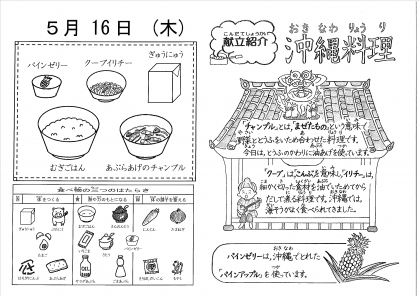 5月16日の献立は,「麦ごはん・牛乳・油あげのチャンプル・クーブイリチー・パインゼリー」でした。