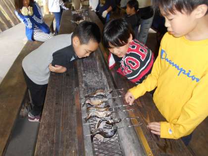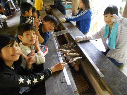 つかんだ魚をさばいて自分たちで焼いてお昼ご飯にします。