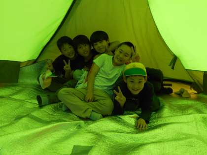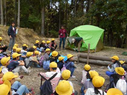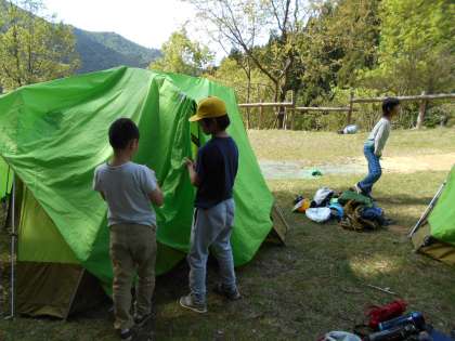 職員さんの話を注意深く聞き,協力して素早くテントを設営していました。