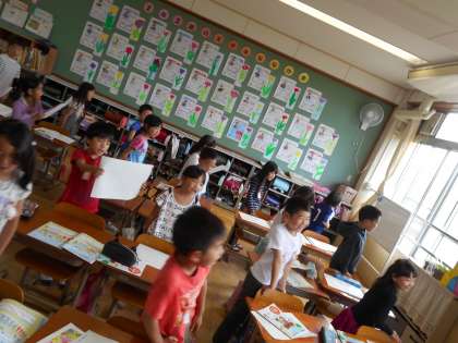 いいお天気になってほしいなという思いを込めて,音楽の時間に「にじ」という曲をお空に向けて歌いました!