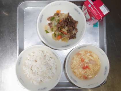 5月23日の献立は,「麦ごはん・牛乳・焼肉・トマトと卵のスープ」でした。焼肉には,ピーマンを使っています。