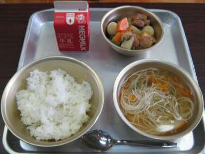 副菜の「ビーフンスープ」には,もやし・にんじん・チンゲン菜が入り,彩りもきれいです。