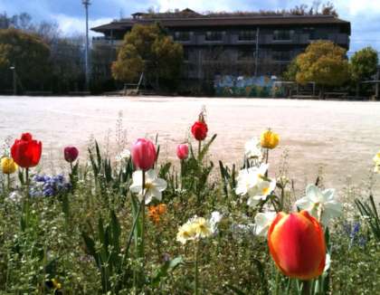 運動場側の花壇でチューリップが美しく花を咲かせています。