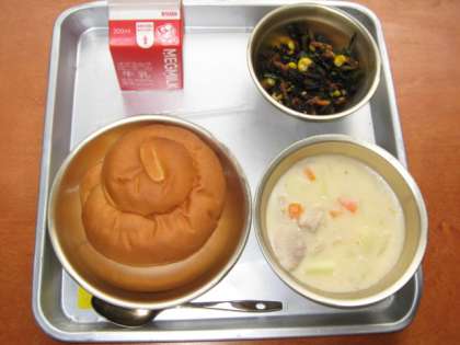 今日のメニューは,『バターうずまきパン・牛乳・じゃがいものクリームシチュー・ひじきのソティ』でした。 「ひじきのソティ」には,にんじん・三度豆・コーンの野菜が入り,彩りもよく よく食べてくれました。
