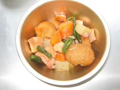 『もやしの煮びたし』は,下味をつけた油揚げとゆがいたにんじん・もやし・小松菜を煮びたしにしました。もやしや小松菜は,しっかりかまないといけない食材です。