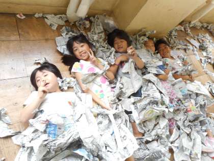 新聞紙に穴をあけて服を作って楽しんだり,輪っかを作って輪投げで遊んだり,新聞紙を丸めたものをたくさん作って新聞のプールで遊んだり,友達と協力して新聞紙をつなげて人が入れる家を作ったりと,発想を広げて楽しい新聞の世界が教室一面に広がりました!