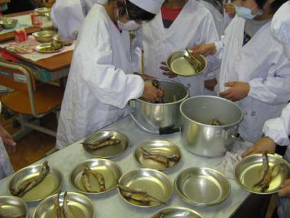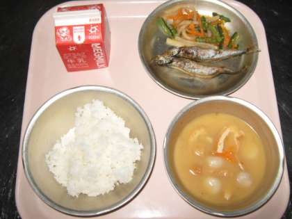 今日は丸ごと食べられる『ししゃものから揚げ』でした。1年生の教室で,「今日のお魚は,ししゃもだよ。頭からしっぽまで全部食べられるよ」と声かけすると,「ほねも・・・?」と。パクパク食べていました。
